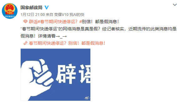 “春节期间快递停运”的网络消息是真是假?经记者核实,近期流传的此类消息均是假消息!