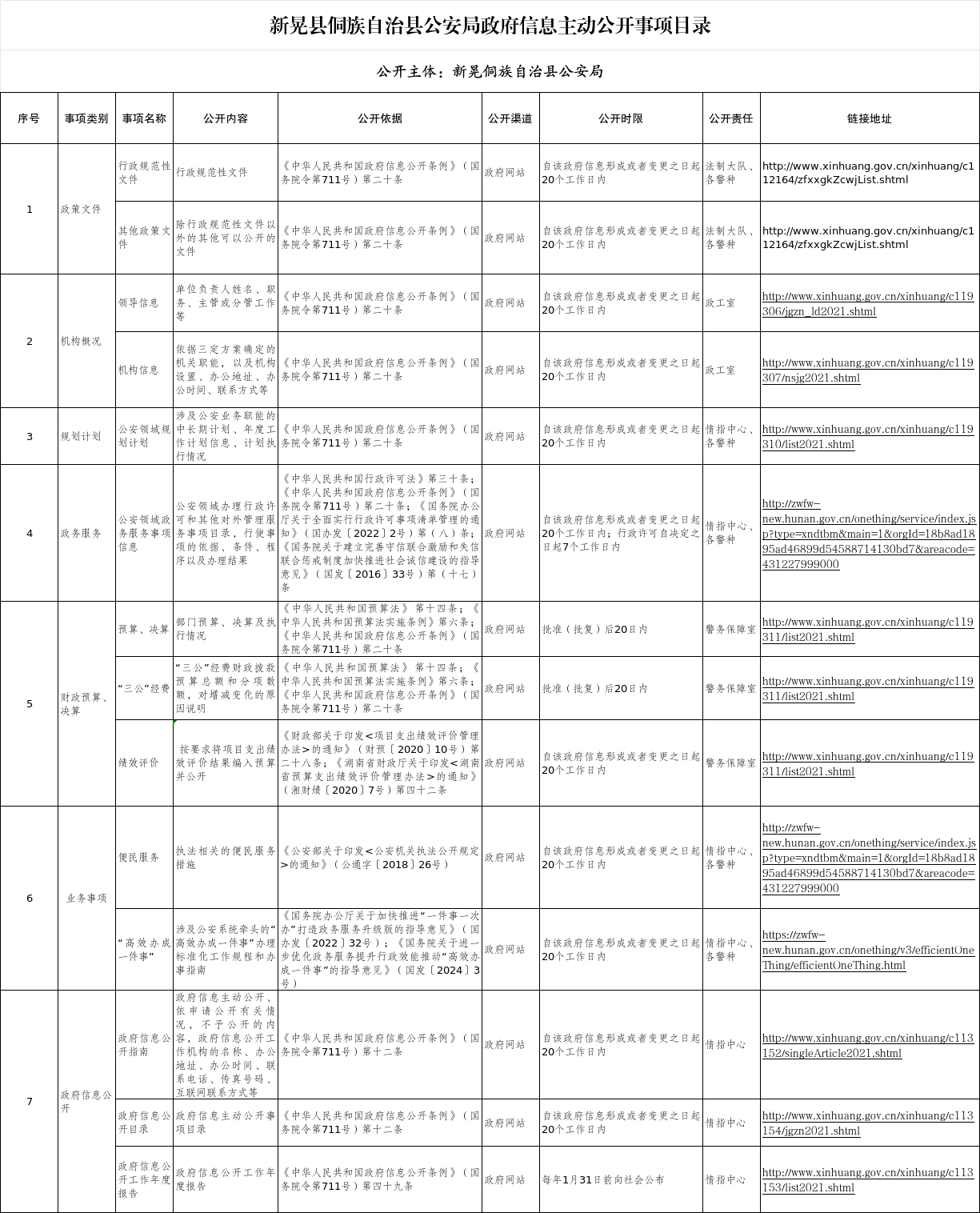 新晃县侗族自治县公安局政府信息主动公开事项目录