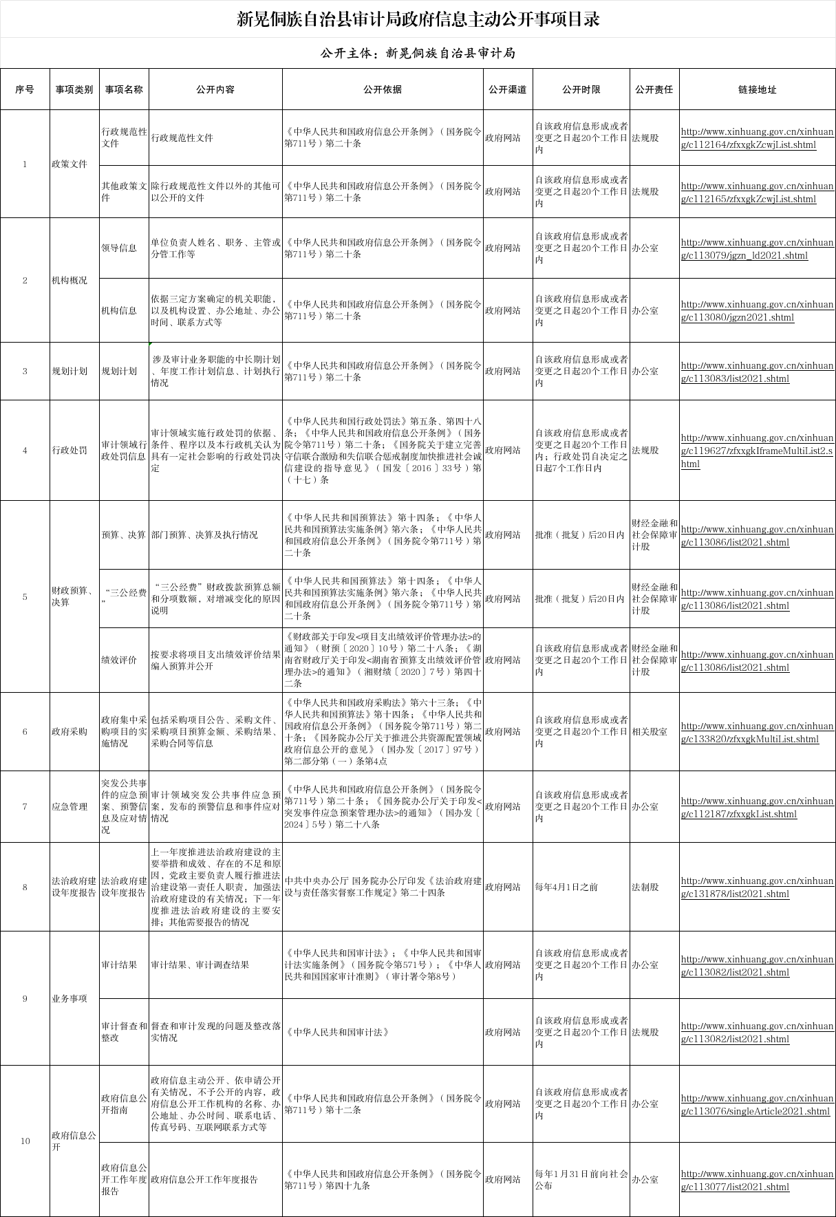新晃侗族自治县审计局政府信息主动公开事项目录