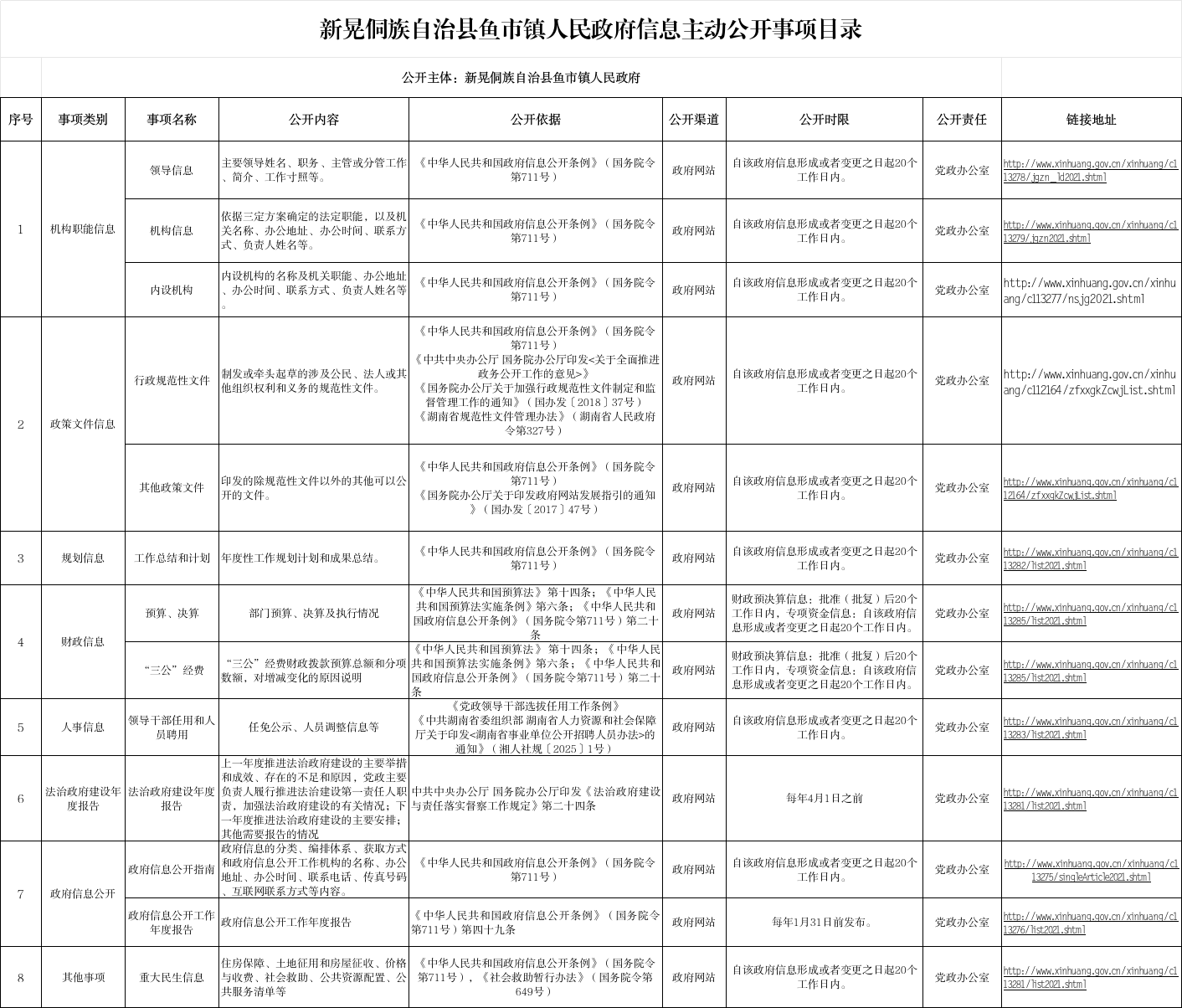 新晃侗族自治县鱼市镇人民政府信息主动公开事项目录