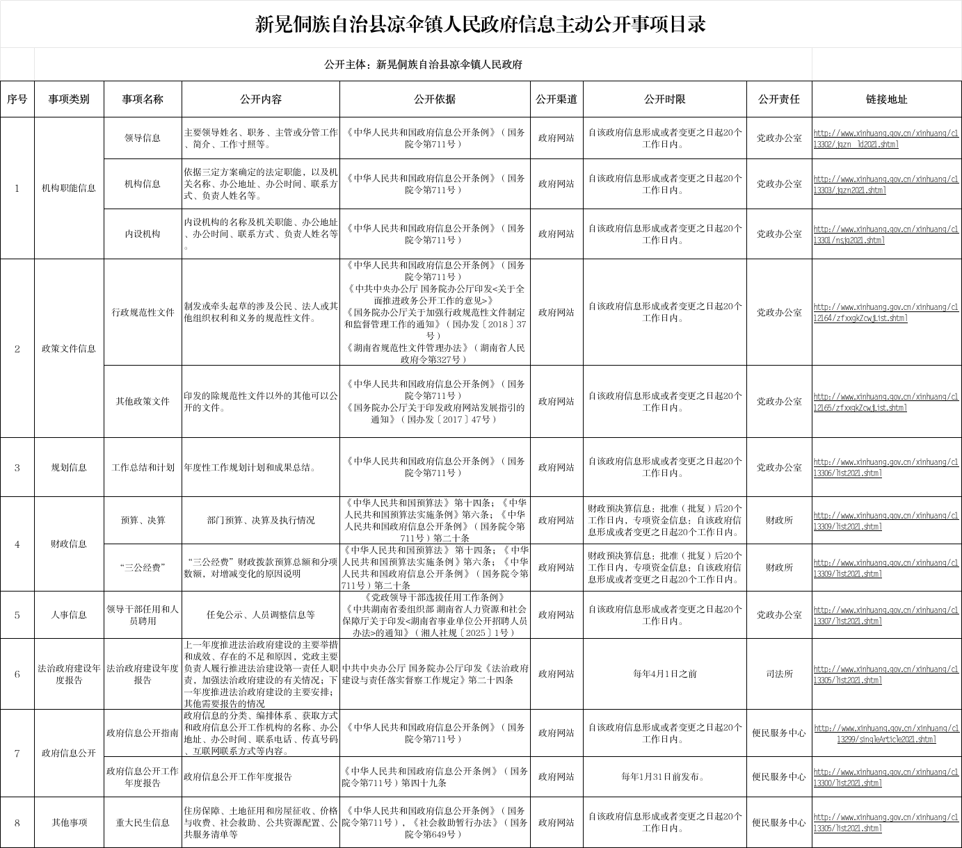 新晃侗族自治县凉伞镇人民政府信息主动公开事项目录