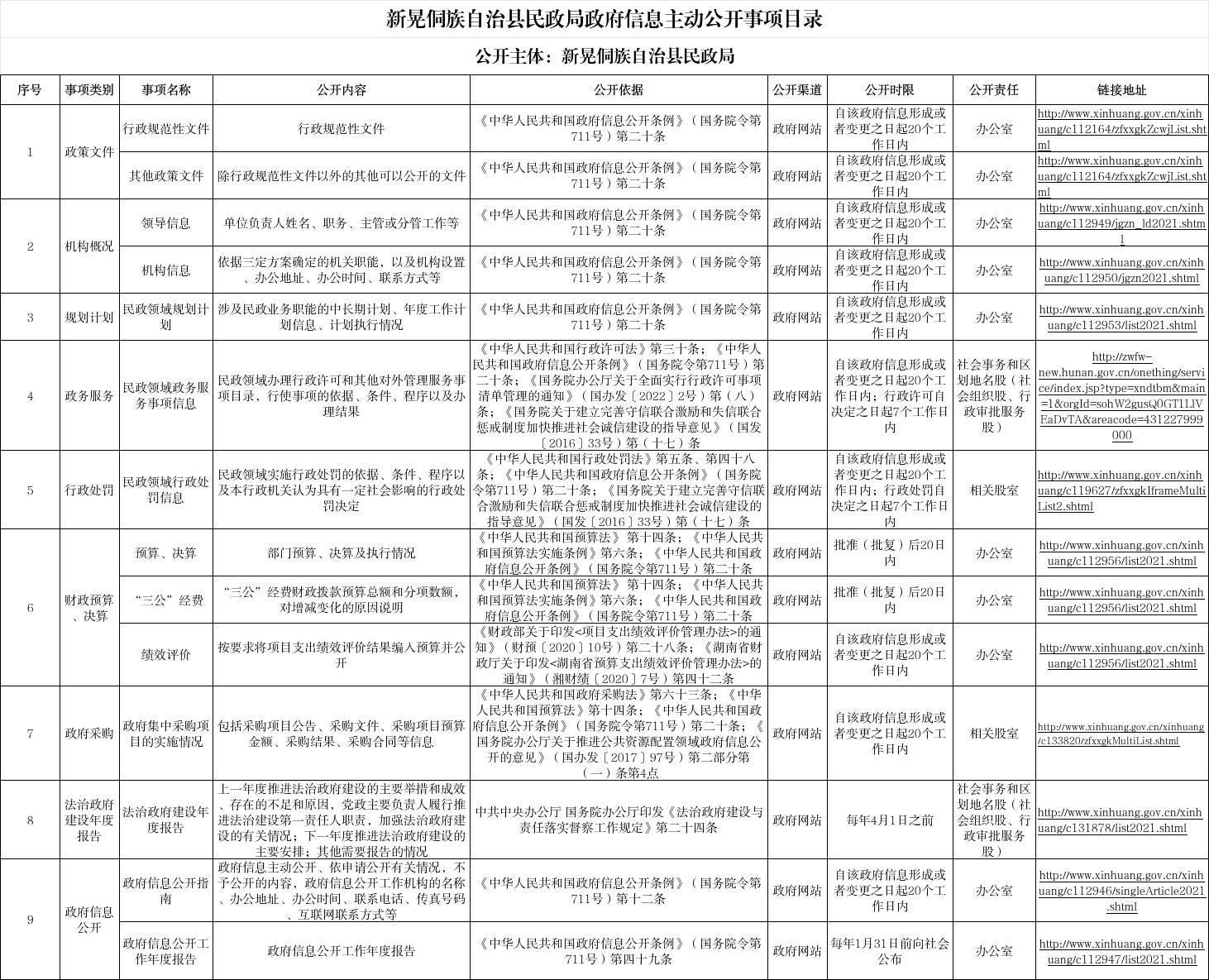 新晃侗族自治县民政局政府信息主动公开事项目录